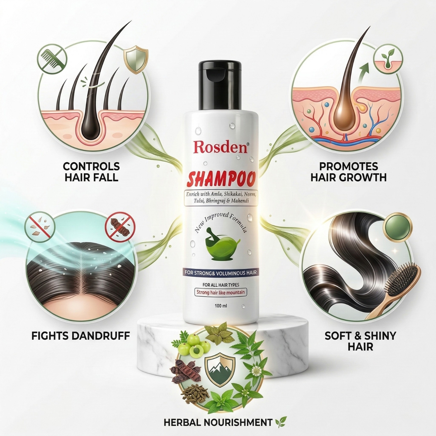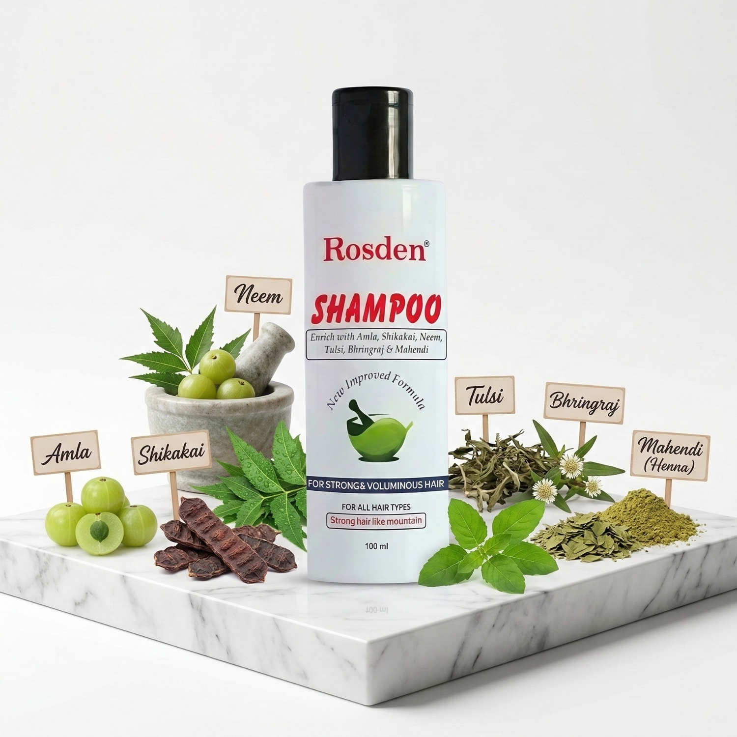 Hair fall can often occur due to scalp buildup, dryness, or environmental factors. Rosden Herbal Shampoo is formulated as a best herbal hair fall control shampoo inspired by Ayurvedic ingredients like amla and neem.