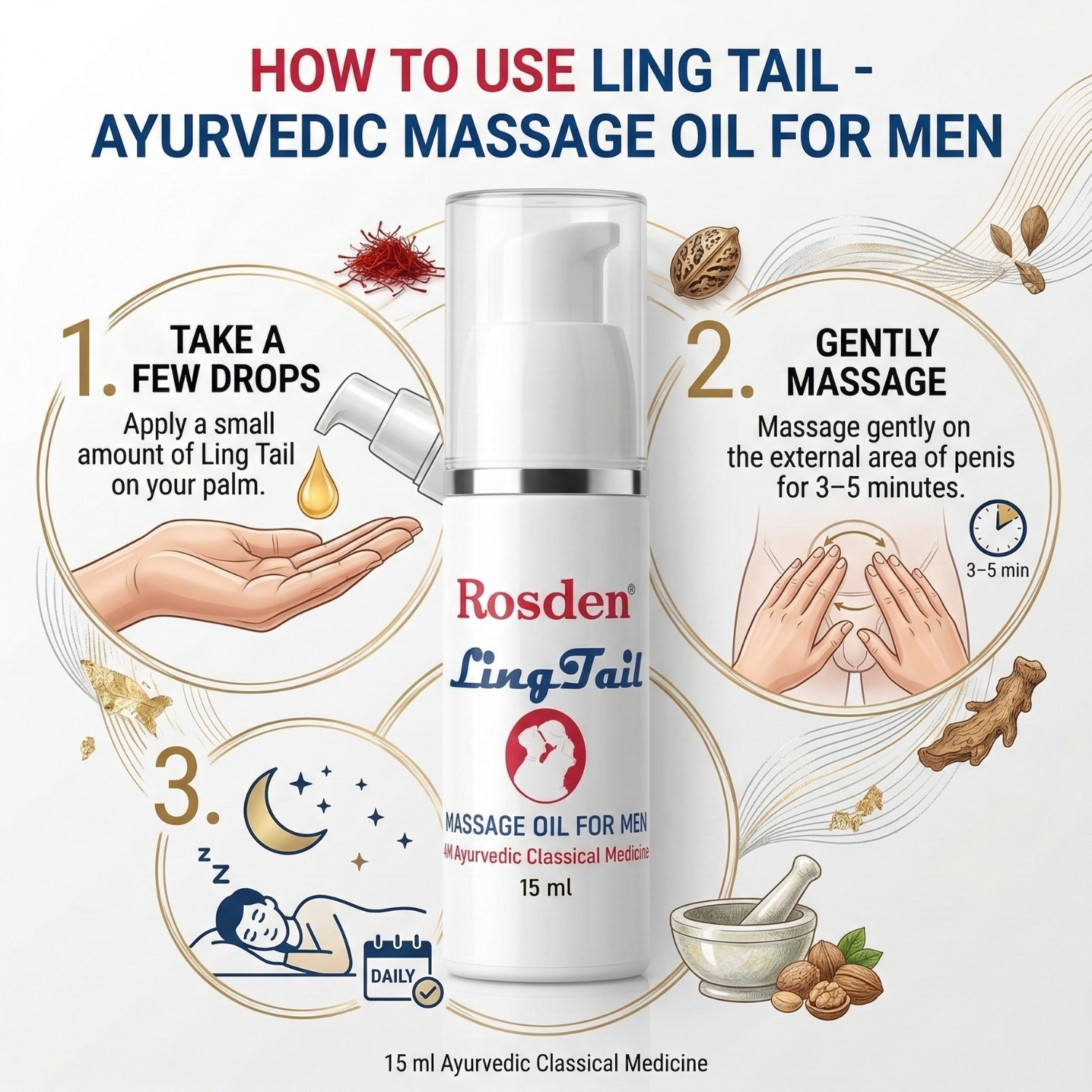 Rosden Ling Tail is easy to apply and suitable for external massage use. It can be used as part of a regular wellness routine for men who want natural Ayurvedic care.